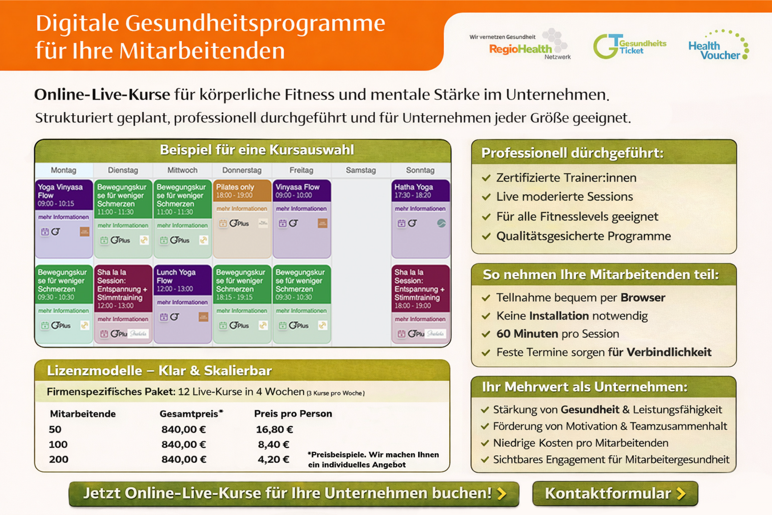 Wenn Sie im Rahmen der betrieblichen Gesundheitsvorsorge Kurse aus allen Handlungsfeldern der Prävention – von Entspannung- und Resilienzkursen, über Rückenschule, Yoga und Pilates bis zu Ernährung- und Suchtentwöhnungskursen – für